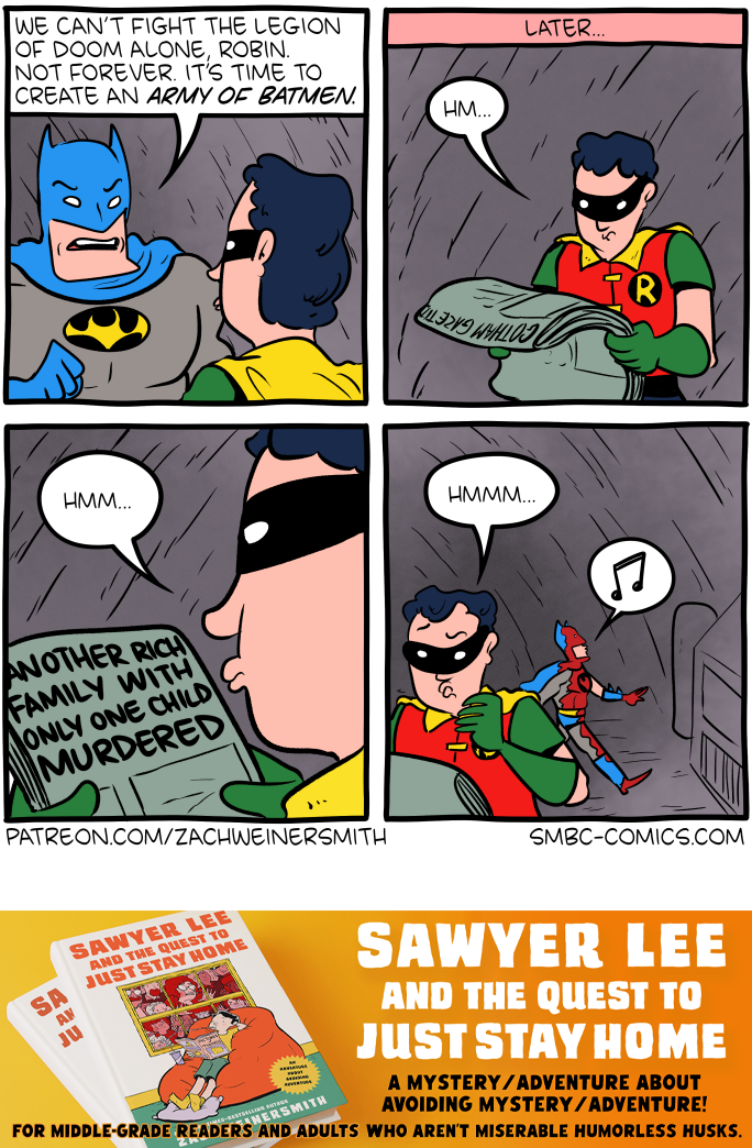 Saturday Morning Breakfast Cereal - Hmm March 13, 2026 Get link Facebook X Pinterest Email Other Apps Click here to go see the bonus panel! Hovertext: Confusingly, many of them grow up to dislike Batman. Today's News: from Saturday Morning Breakfast Cereal https://ift.tt/dZqFugr Comments